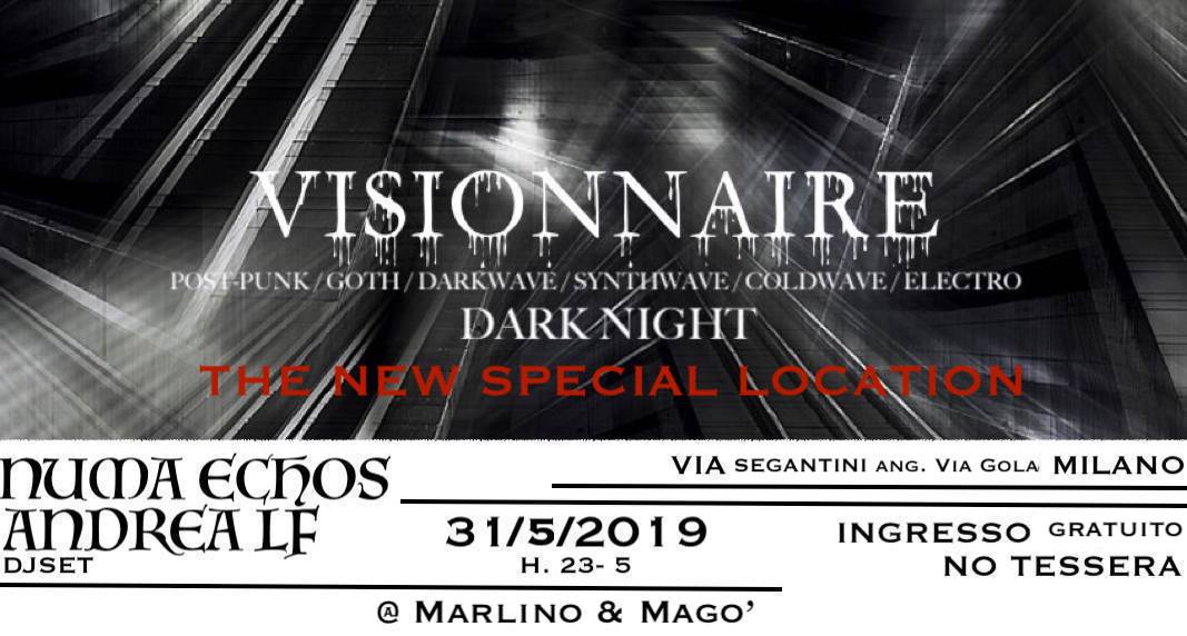 VISIONNAIRE is a new “underground” musical situation, a “dark night” born from the collaboration between some djs and musician of the Milan’s alternative scene, Numa Echos and Andrea LF, characterized by audible sounds and not, danceable rhythms and melancholy dark, able to catalyze more restless and rebellious souls.